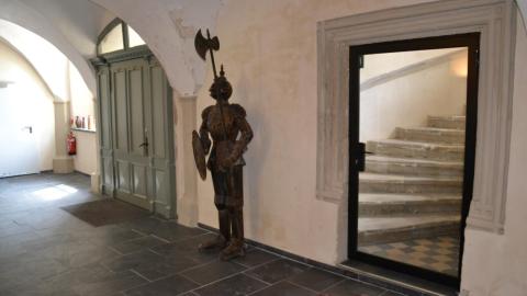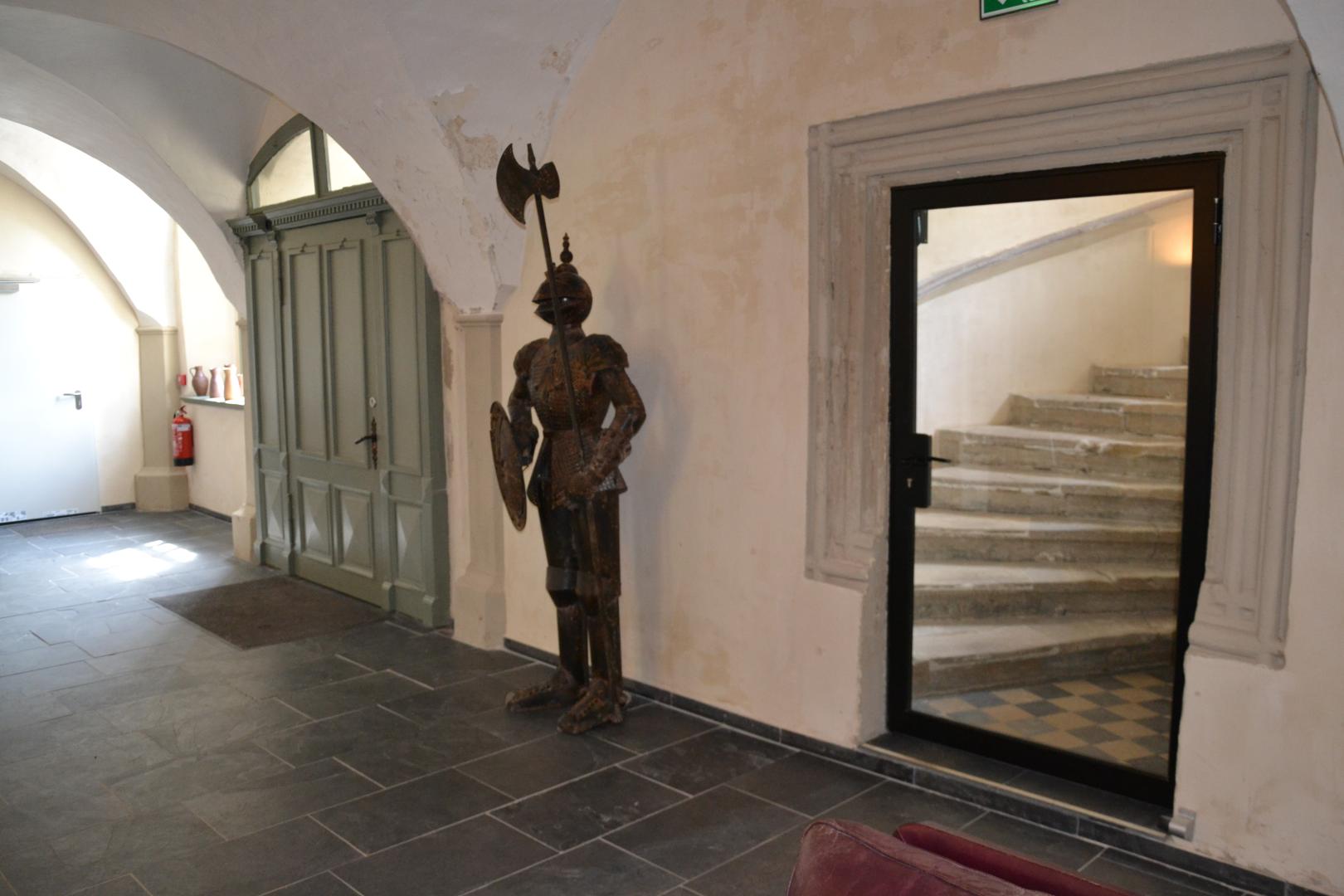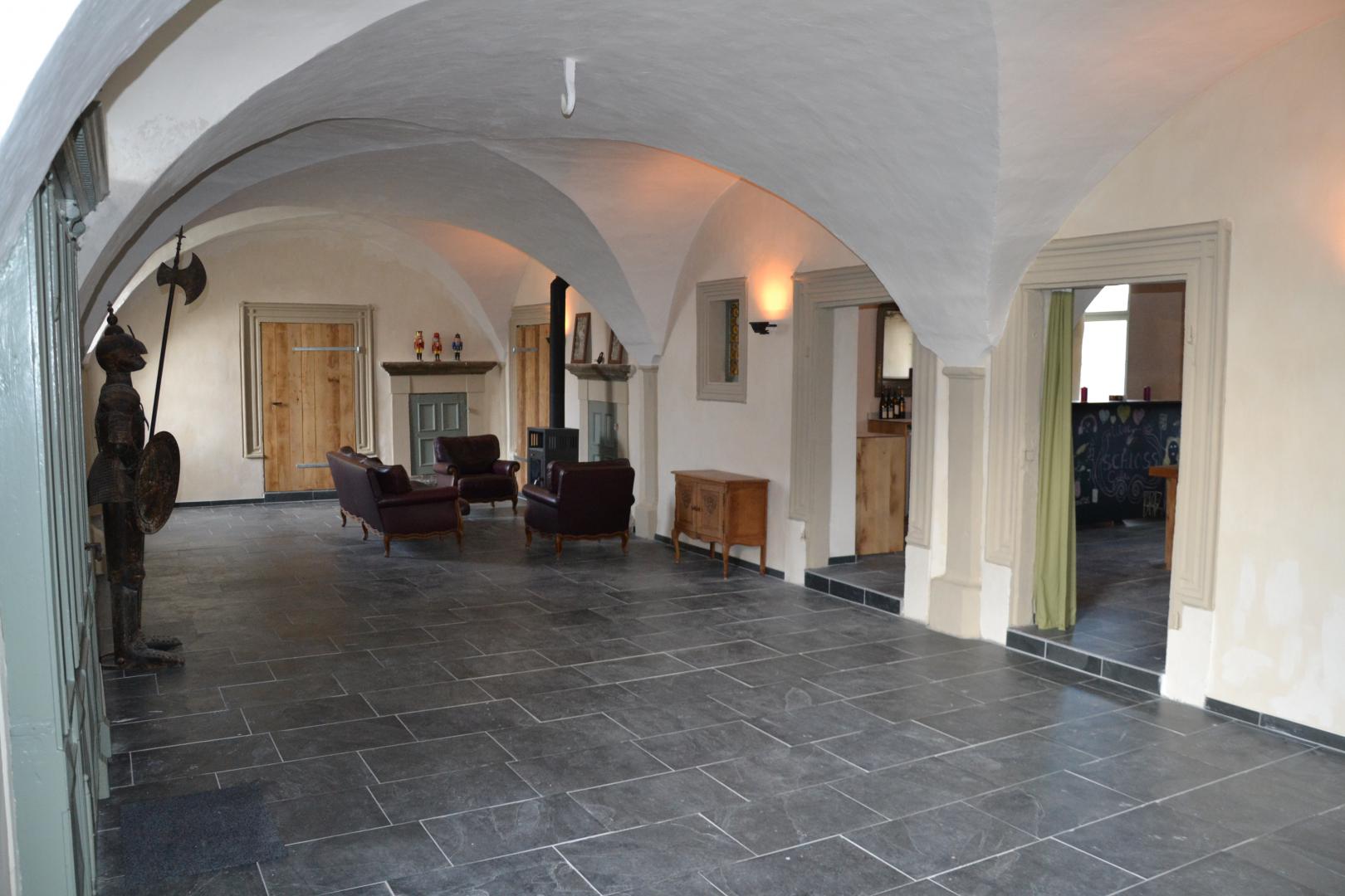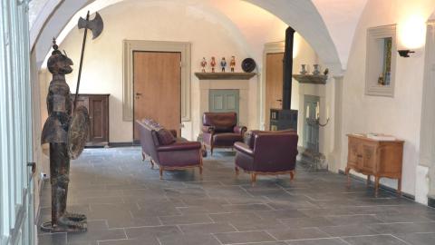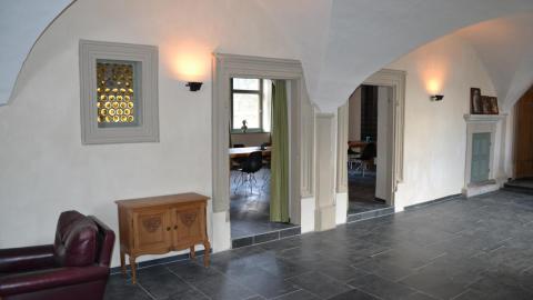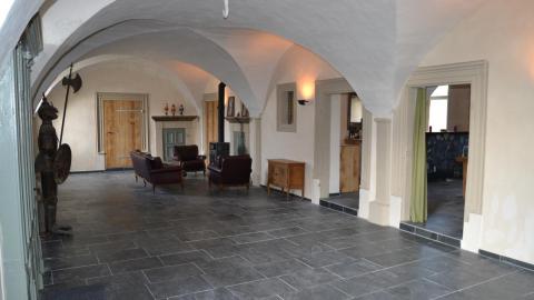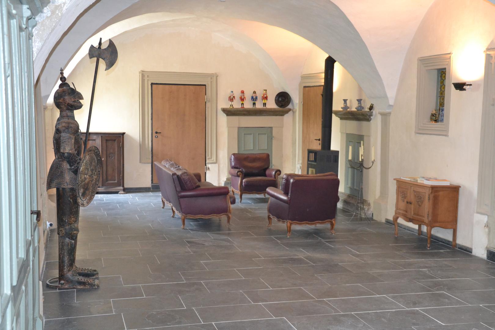Die erste Etage des Schlosses erreicht man über den monumentalen Treppenturm. Dort betritt man eine große Gemeinschaftshalle. Die umliegenden Räume können leicht in vier geräumige Ferienwohnungen für vier bis sechs Personen aufgeteilt werden. Im zweiten Stock gibt es Platz für weitere vier Apartments.