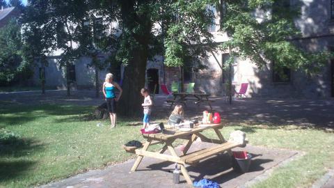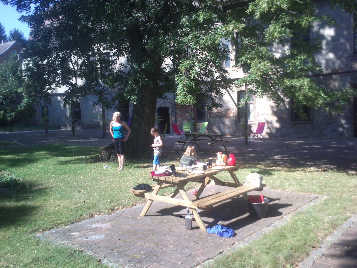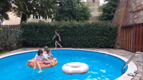 Beim Erkunden der leeren Räume nahmen die vagen Ideen, die wir von Ferienwohnungen hatten, die wir im Sommer vermieten wollten, immer konkretere Formen an. Das Gebäude bietet dafür viele Möglichkeiten. Im Erdgeschoss stellen wir uns eine gemeinsame Halle und einen Speisesaal vor. Außerdem eine private Wohnung, ein Gästezimmer und vielleicht später einen Wellnessbereich mit Sauna und Whirlpool. Im großen, schattigen Garten gibt es bereits eine Terrasse, auf der wir uns einen kleinen Pool vorstellen. Vor dem Gebäude liegt ein kleiner kommunaler Spielplatz – ideal für Kinder.